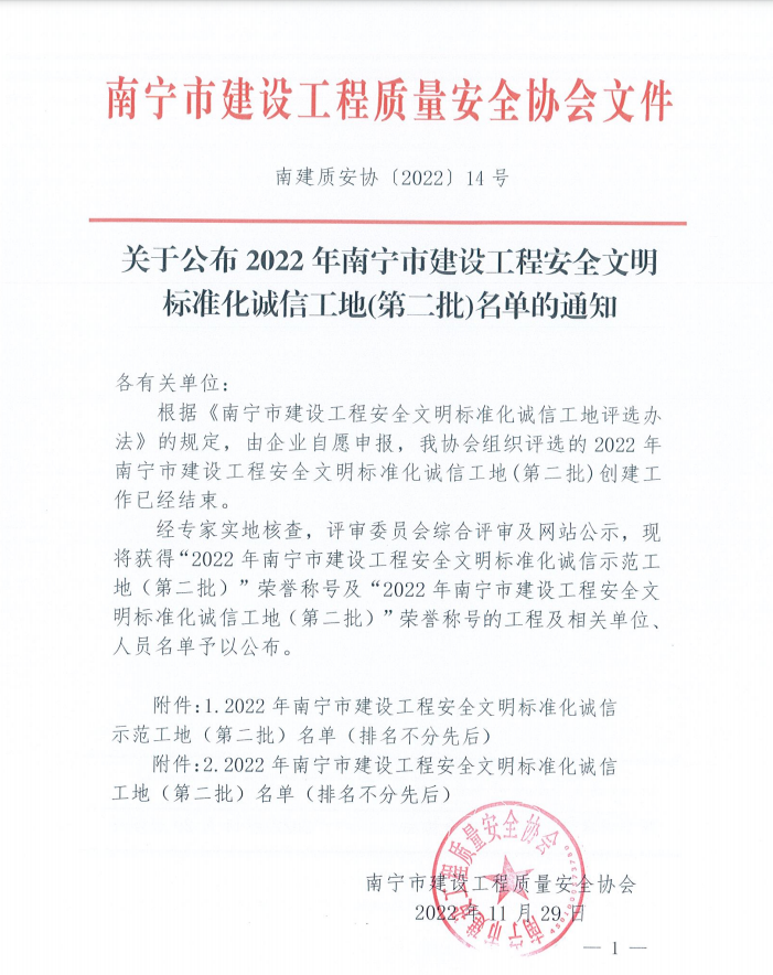 ▲2022年南寧市建設(shè)工程安全文明標(biāo)準(zhǔn)化誠信工地(第二批)獲獎名單