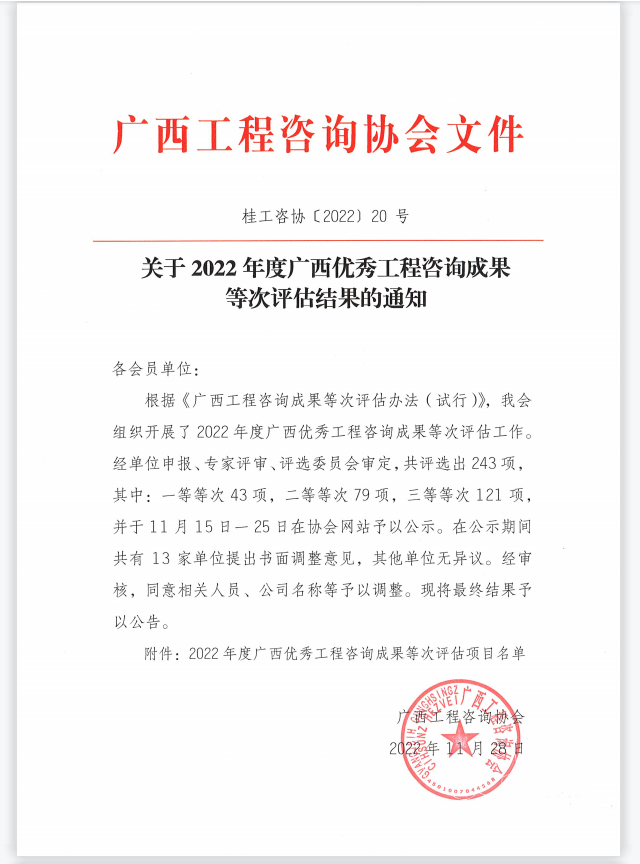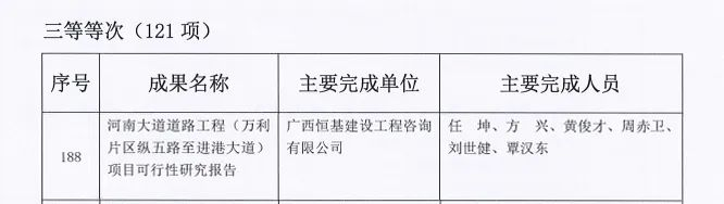 近日,2022年度廣西優秀工程咨詢成果獎獲獎項目名單揭曉。經協會專家評審,評選委員會審定,廣西恒基建設工程咨詢有限公司參與的《河南大道道路工程(萬利片區縱五路至進港大道)項目可行性研究報告》榮獲2022年度廣西優秀工程咨詢成果獎三等獎。