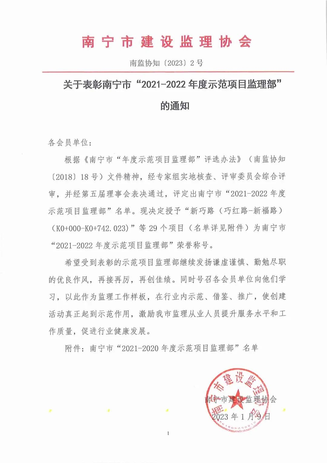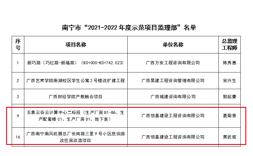 1月9日,南寧市建設監理協會2021-2022年度示范項目監理部名單揭曉,恒基咨詢在眾多參評項目中脫穎而出,公司的監理項目五象云谷云計算中心二標段(生產廠房B1-B6、生產配套樓C1、生產廠房D1、地下室)以及廣西南寧南風機器總廠長崗路三里9號小區危舊房改住房改造項目榮獲南寧市“2021-2022年度示范項目監理部”稱號。