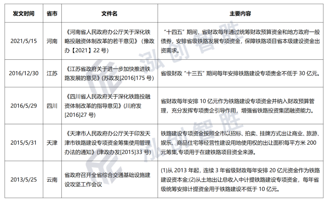 (4)地方鐵路發展基金,很多地方成立了省級的地方鐵路發展基金,在省級層面通過吸引財務投資人等手段籌措鐵路項目資本金。