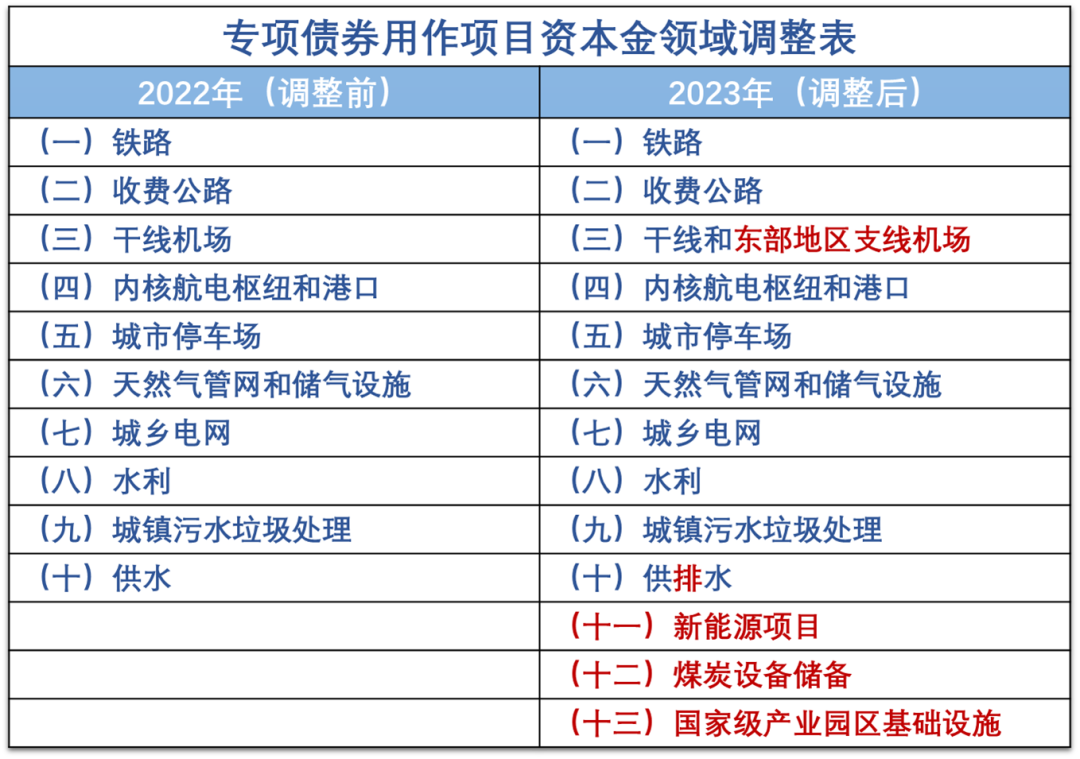 2022年監管部門明確(2022年下半年起、2023年投向),可用作項目資本金的投向領域在原有10個領域的基礎上增加新能源項目、煤炭儲備設施、國家級產業園區基礎設施3項,專項債可作資本金領域由此擴大至13項。