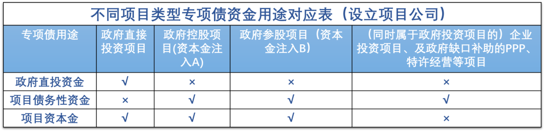 在目前的實踐中,使用政府付費或可行性缺口補助的PPP、特許經營項目被認定為企業投資項目。但完全由政府付費的PPP項目不具備市場化收益,與專項債的發債精神相悖,不適宜發行專項債。因此,運營期政府可行性缺口補助的PPP、特許經營項目,也應可以使用專項債。同理,政府沒有參股的,專項債只能用作債務性資金。