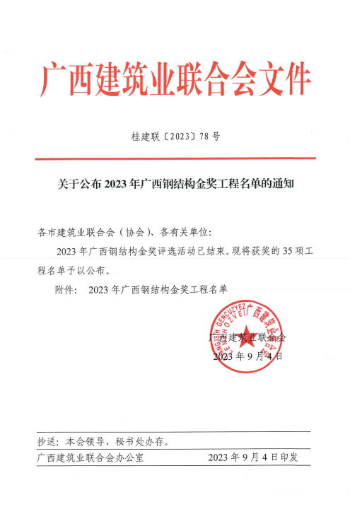 “廣西鋼結(jié)構(gòu)金獎(jiǎng)”是由廣西建筑業(yè)聯(lián)合會(huì)設(shè)立的廣西鋼結(jié)構(gòu)優(yōu)質(zhì)工程最高榮譽(yù)獎(jiǎng)項(xiàng),獎(jiǎng)項(xiàng)從工程質(zhì)量與管控、施工難度、技術(shù)創(chuàng)新、工程管理四個(gè)方面評(píng)選,旨在鼓勵(lì)和表彰區(qū)內(nèi)優(yōu)質(zhì)鋼結(jié)構(gòu)項(xiàng)目,提高廣西建筑鋼結(jié)構(gòu)工程的質(zhì)量。