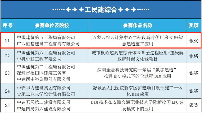 近日,由工業和信息化部人才交流中心主辦的2023第六屆“優路杯”全國BIM技術大賽公布獲獎名單,恒基咨詢報送的作品《五象云谷云計算中心二標段新時代廠房BIM+智慧建造施工應用》榮獲大賽銀獎。