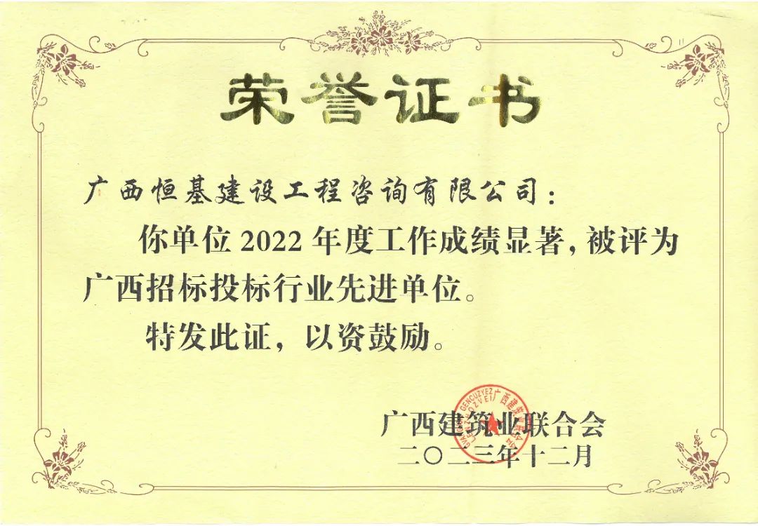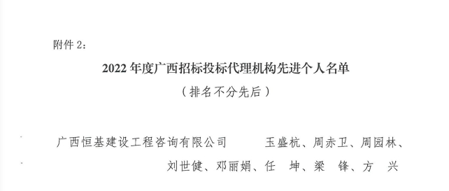 12月25日,廣西建筑業聯合會招標投標分會召開第二屆第五次會員代表大會,會上表彰了2022年度廣西招標投標行業先進單位和先進個人。恒基咨詢榮獲“2022年度廣西招標投標行業先進單位”稱號,公司8人獲評“2022年度廣西招標投標行業先進個人”。