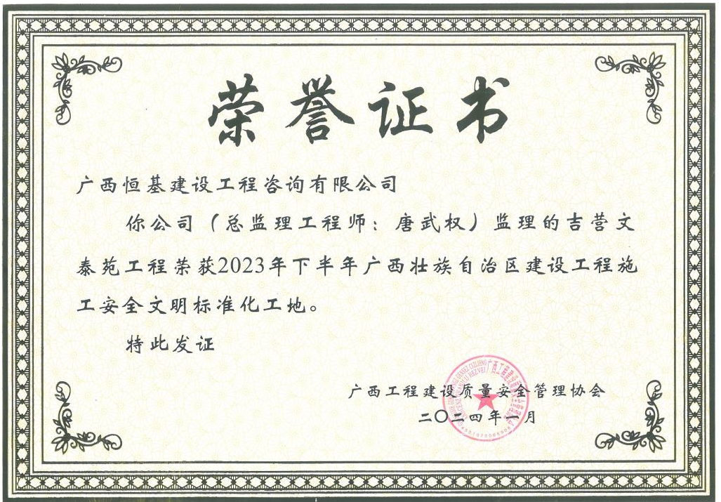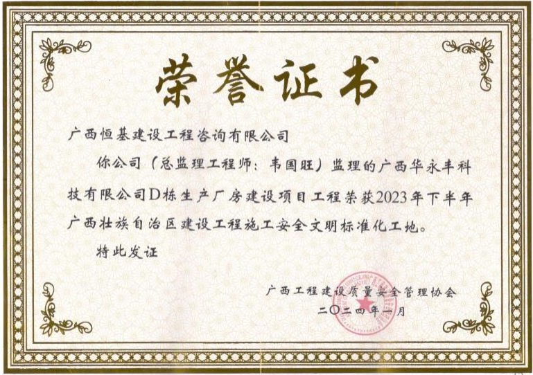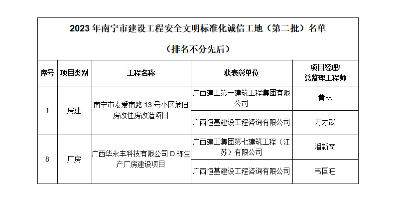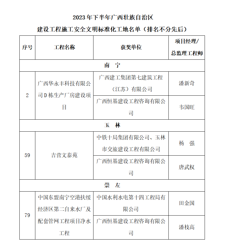 近日,廣西工程建設質量安全管理協會、南寧市建設工程質量安全協會分別公布了2023年下半年廣西壯族自治區建設工程施工安全文明標準化工地名單、2023年南寧市建設工程安全文明標準化誠信工地(第二批)名單。恒基咨詢3個項目榮獲2023年下半年廣西壯族自治區建設工程施工安全文明標準化工地,2個項目榮獲2023年南寧市建設工程安全文明標準化誠信工地。
