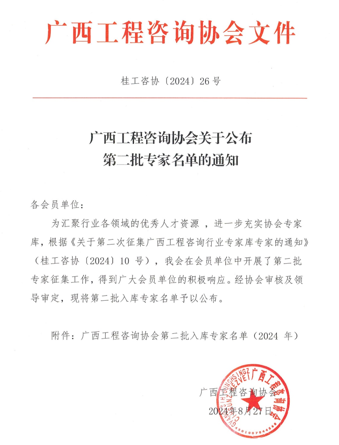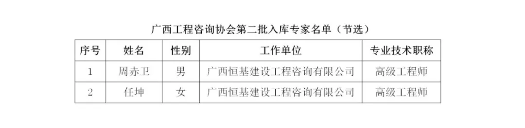 2024年8月27日,廣西工程咨詢協會公布了第二批入庫專家名單,廣西恒基建設工程咨詢有限公司周赤衛、任坤2位專家順利入庫。