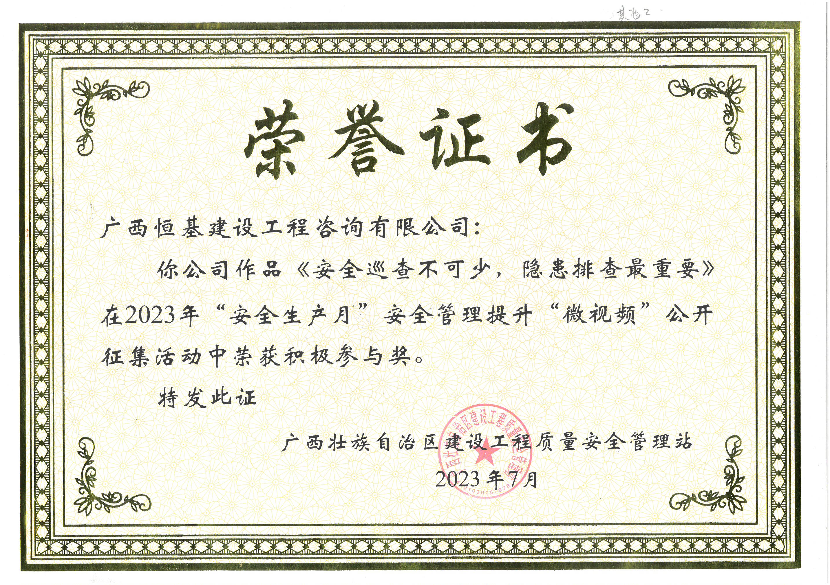 《安全巡查不可少,隱患排查最重要》獲2023年“安全生產月”安全管理提升“微視頻”公開征集活動積極參與獎