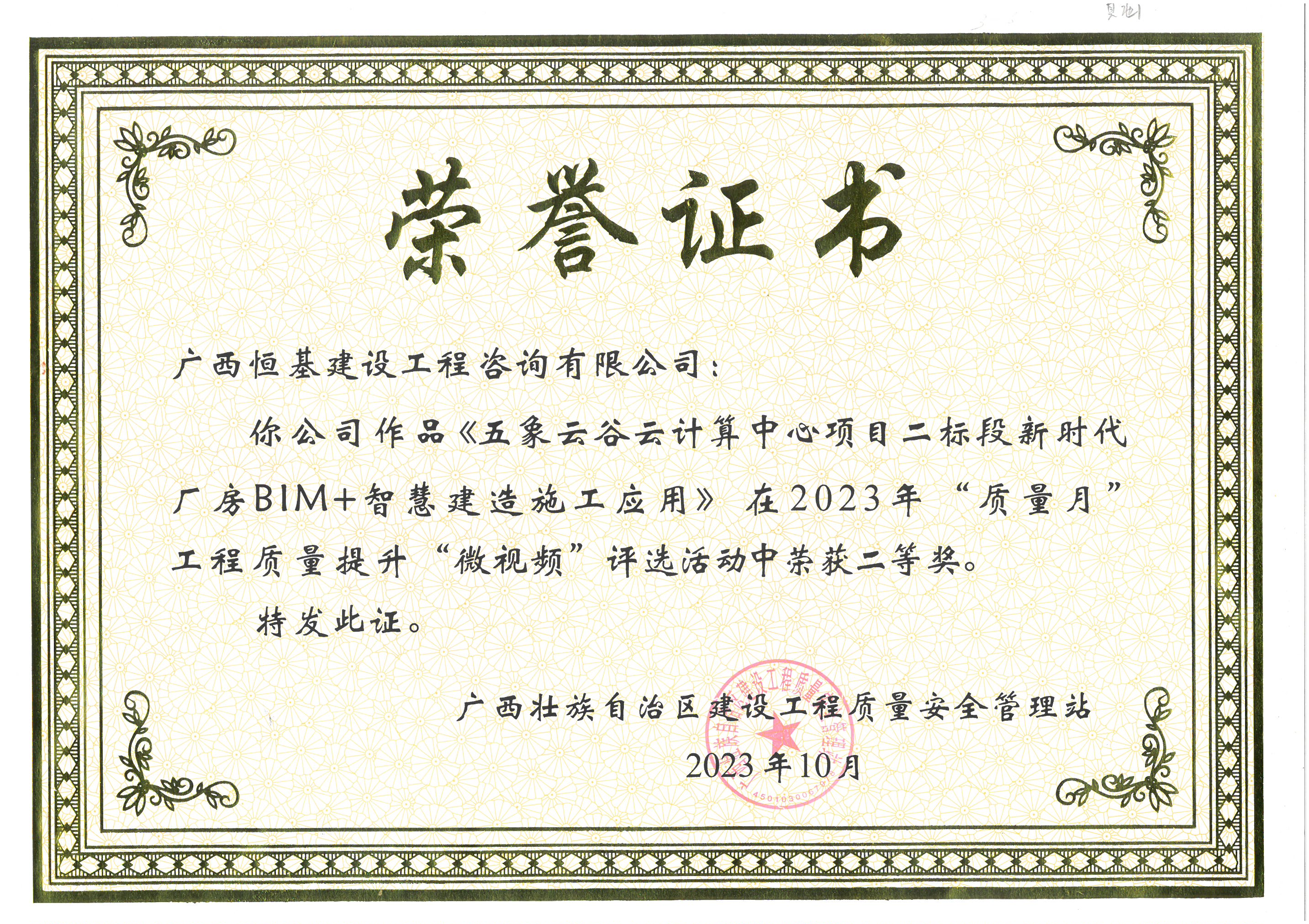《五象云谷云計算中心項目二標段新時代廠房BIM+智慧建造施工應用》獲2023年“質量月”工程質量提升“微視頻”評選活動二等獎