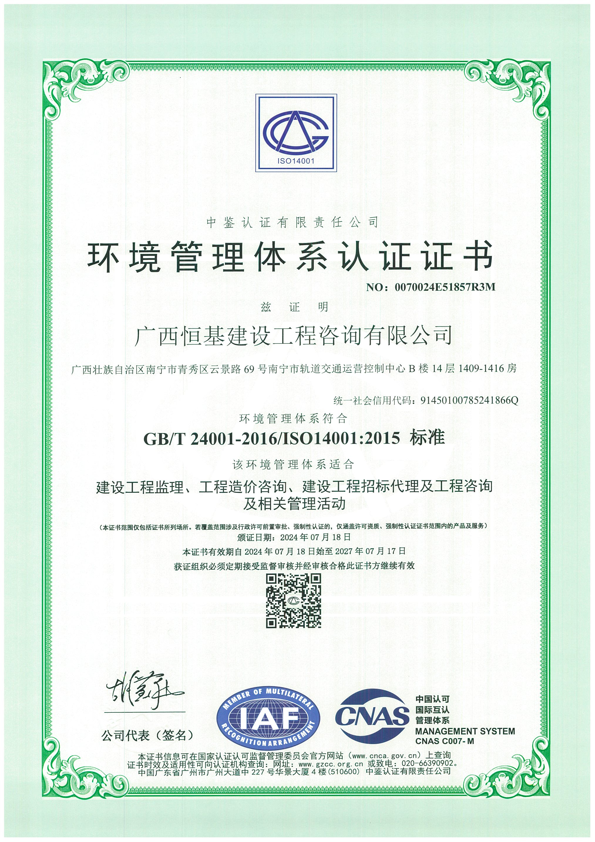 環境管理體系認證證書