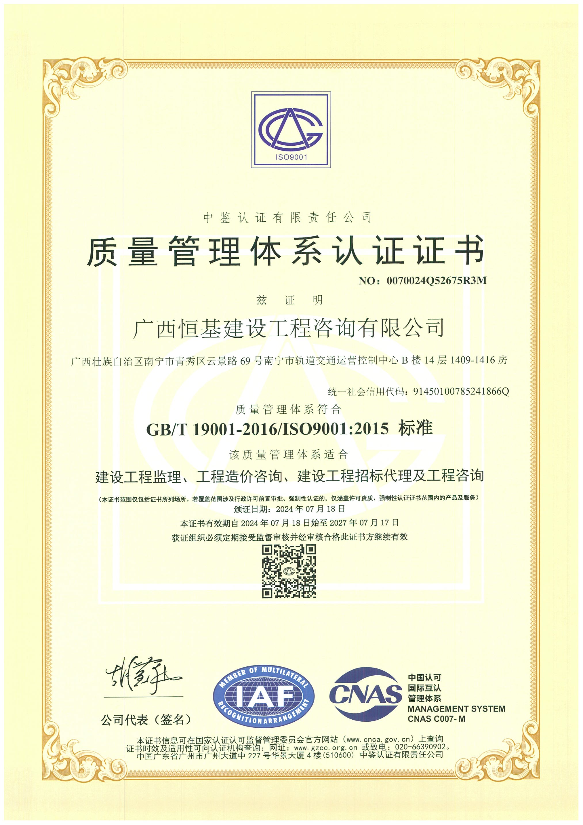 質量管理體系認證證書