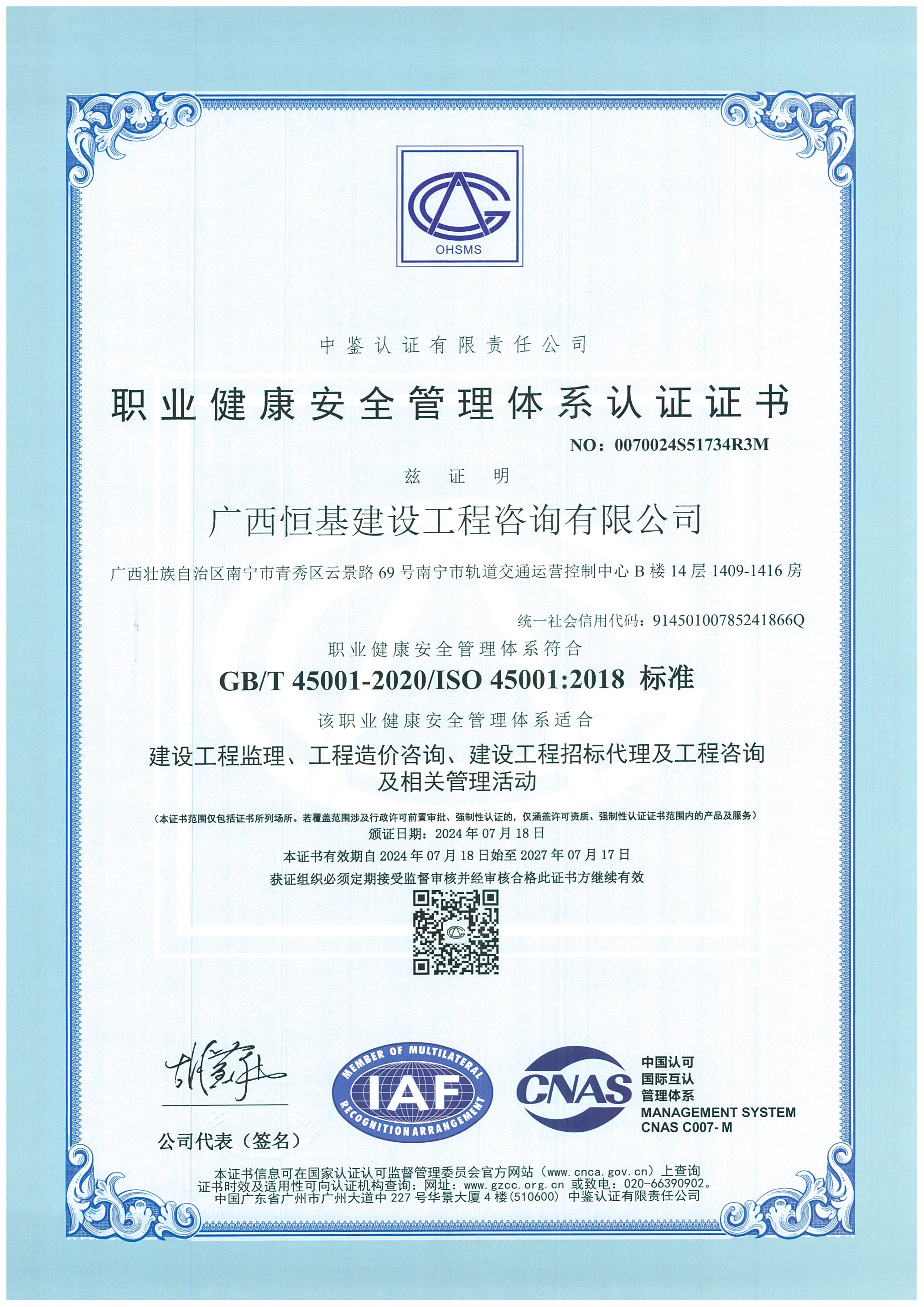 職業健康管理體系認證證書